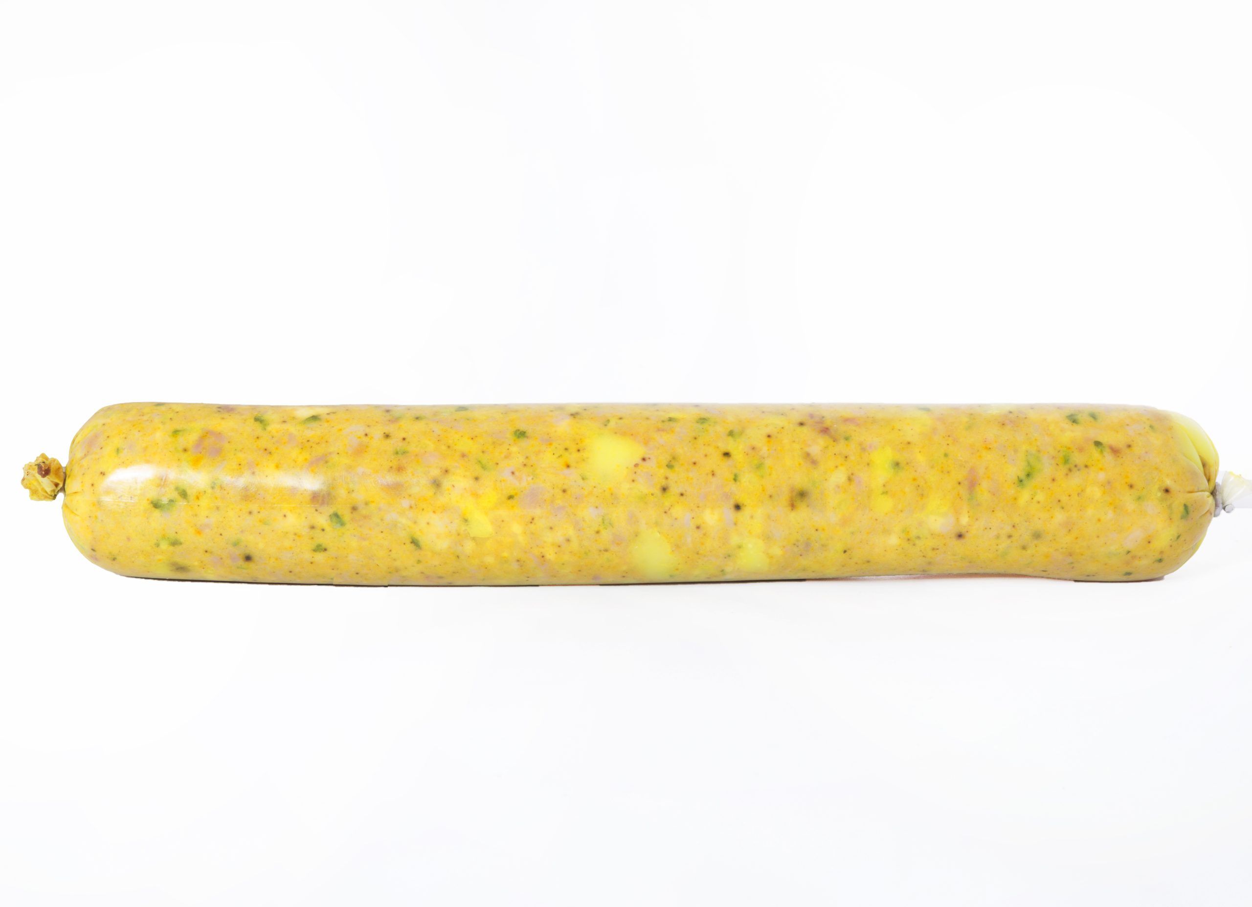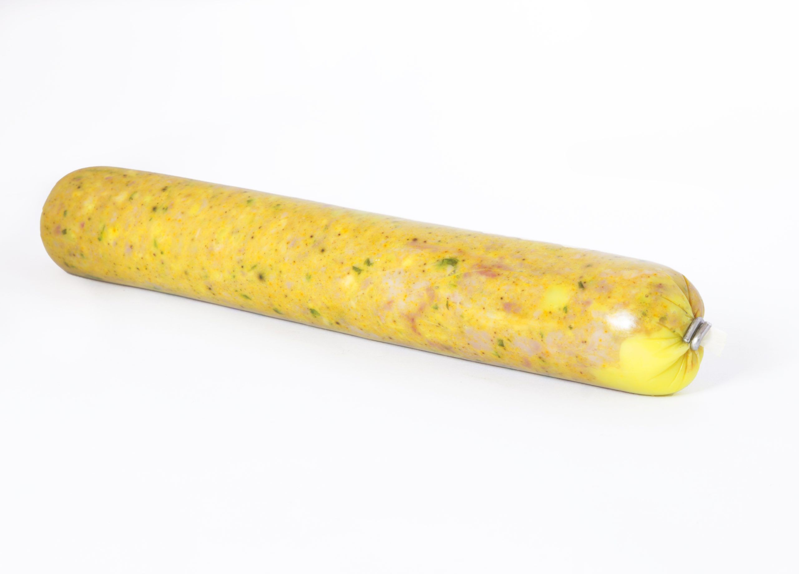 Composición: Magro de cerdo, sal, almidón, especias, emulgente E-451i , potenciador del sabor E-621, fécula de patata, HUEVO (3,48%), sal, emulgentes: E-451i, E-407a, E-452i, E-450i, PROTEINA DE SOJA, dextrosa, azúcar, antioxidantes: E-331iii, E-301, E-325, conservadores: E-262i, E-250, potenciador del sabor E-621, coadyuvantes tecnológicos E-551, curcuma. Tripa no comestible